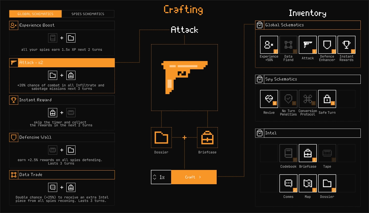 Schematics are temporary strategic boosts crafted by combining Intel NFTs, which are earned via Recon missions. Schematics are non-transferable and adds depth to PvP decision-making playing a critical role in augmenting gameplay through buffs and defensive/utility effects.