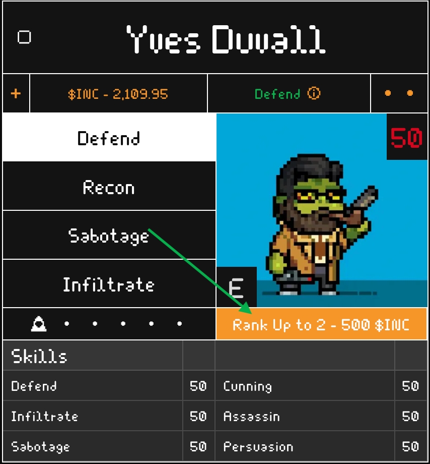 In total there are 7 rank upgrades, and NFTs start at rank 0, each being instant once bought (and have a cd of 1 turn for the next upgrade?) where $INC is used to move the spy NFT up the ranks.