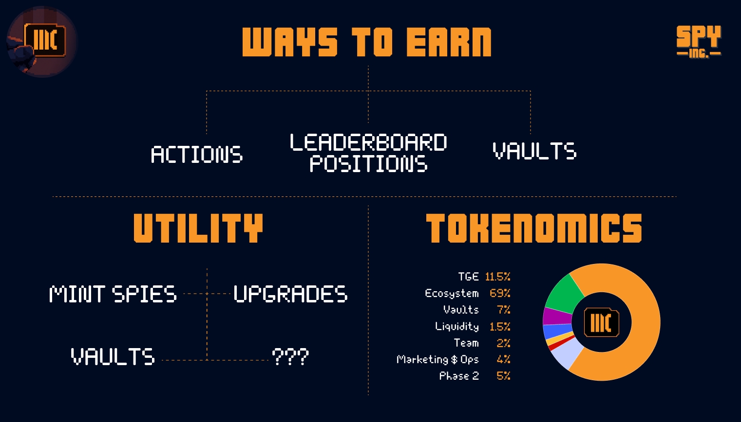 $INC is the native utility and reward token of Spy Inc, driving gameplay, progression, crafting, and the broader game economy. Its design balances sustainable emissions, strategic sinks, and long-term player incentives. The total supply of $INC Is 1,000,000,000.